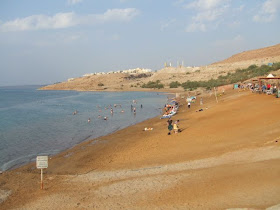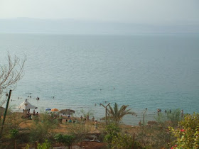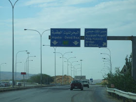 アンマンを出てから約1時間ほど走った頃、海抜ゼロメーターを示す看板の前をとおりすぎ、正面奥に死海が見えてくる。思っていたよりもずっとでかい。うんてんしゅのおじさんは、死海の向こうに見える陸地がイスラエルだと教えてくれる。