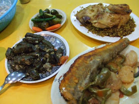 歩き方にも載っているカイロレストランというレストランに行く。20種類ほどの料理がショーケースに入っており、そこから選ぶ。1品1人ぶんがどれもだいたい2ディナール(約350円)程度。高い。