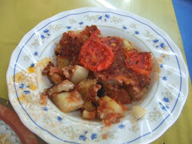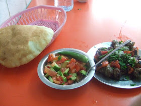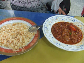 ご飯は油で炒めたようなご飯で多少味がついている。おかずは数種類あった中から選んだが、たいていどれもトマトベースの味。ミートソースのようなものからじゃがいもとトマトとなす、挽き肉を重ねてオーブンで焼いたようなもの、シシケバブとじゃがいものトマトスープ煮みたいなものをそれぞれ食べる。味はまぁまぁ。