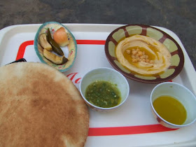 ターミナル(バスステーション)とは言うものの別に立派な駐車場があるわけではなく、バスは路上駐車で、チケットはレストランの片隅に置かれている机で係りの人が発券するというスタイル。帰りのバスは200シリアポンド(約400円)。ダマスカス行きのバスは10分後に出るとのことだったが、飯を食べてもまだ大丈夫とのことだったのでレストランで昼食。おかず小皿1皿にご飯1皿で100シリアポンド。150と言われたのをまけてもらう。