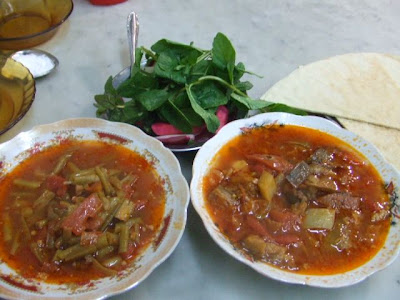 途中、飯屋で食事。ナスと挽き肉のトマト煮とインゲンのトマト煮。これに付け合わせのパン(平たい円形のパン)と生唐辛子、生の赤カブ、赤カブのピクルス、そして生のミントが数本つく。ナスの方は酸味が強かった。計100シリアポンド(約200円)。